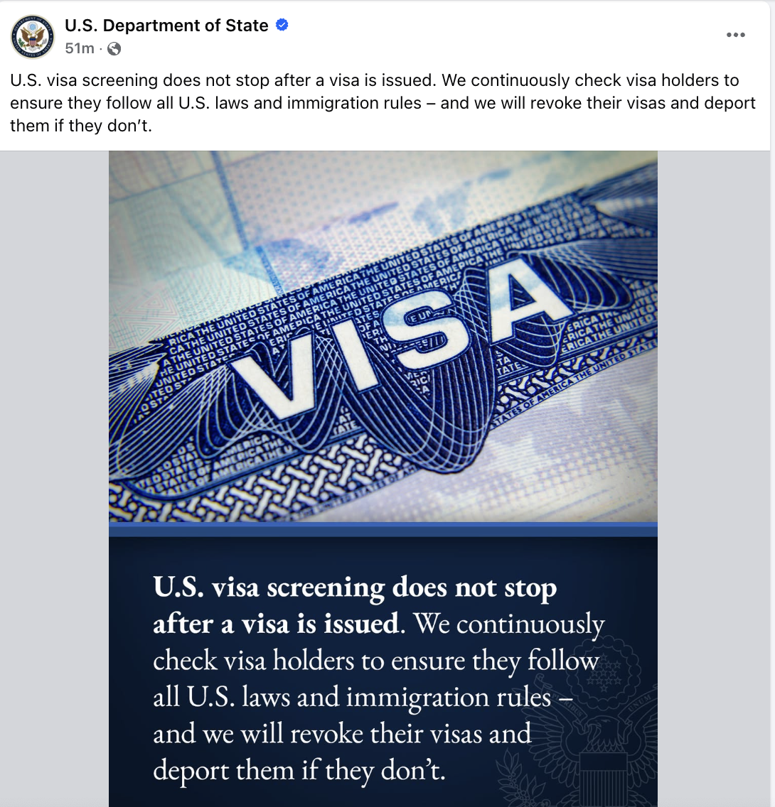 “U.S. visa screening does not stop after a visa is issued. We continuously check visa holders to ensure they follow all U.S. laws and immigration rules – and we will revoke their visas and deport them if they don’t,” the department stated.