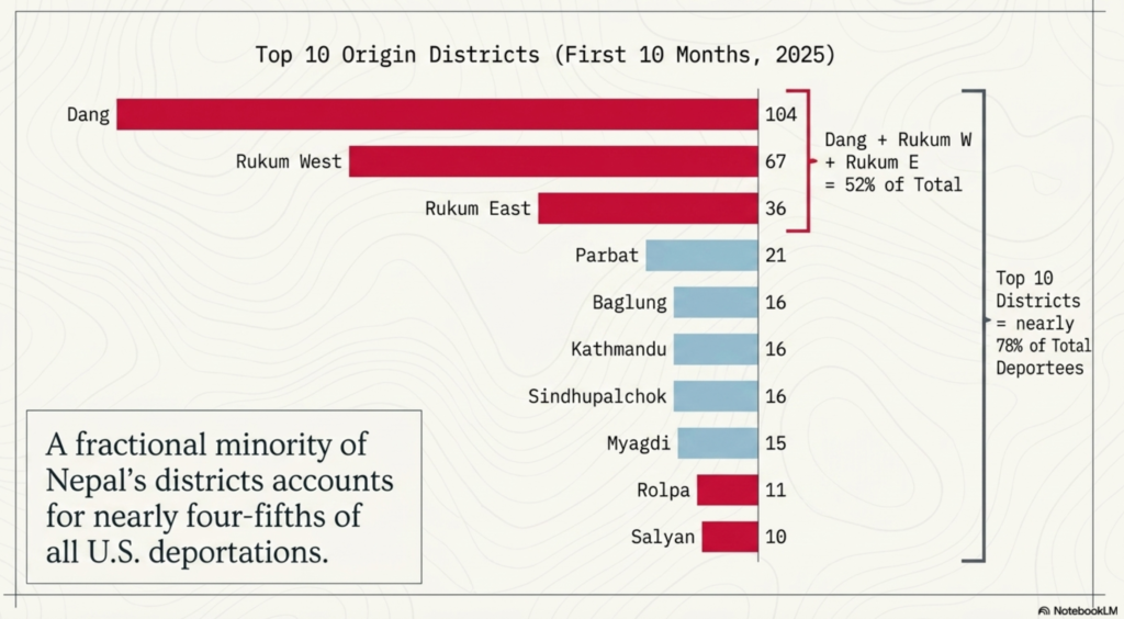 Dang topped the list with 104 deportees in that period. Rukum West had 67, Rukum East 36, Parbat 21, Sindhupalchok 16, Myagdi 15, Baglung 16, Kathmandu 16, Rolpa 11 and Salyan 10. Another 88 deportees came from other districts. Together, the 10 highest-origin districts accounted for nearly 78% of all deportees, while the top three districts alone made up 52%, according to the report.
