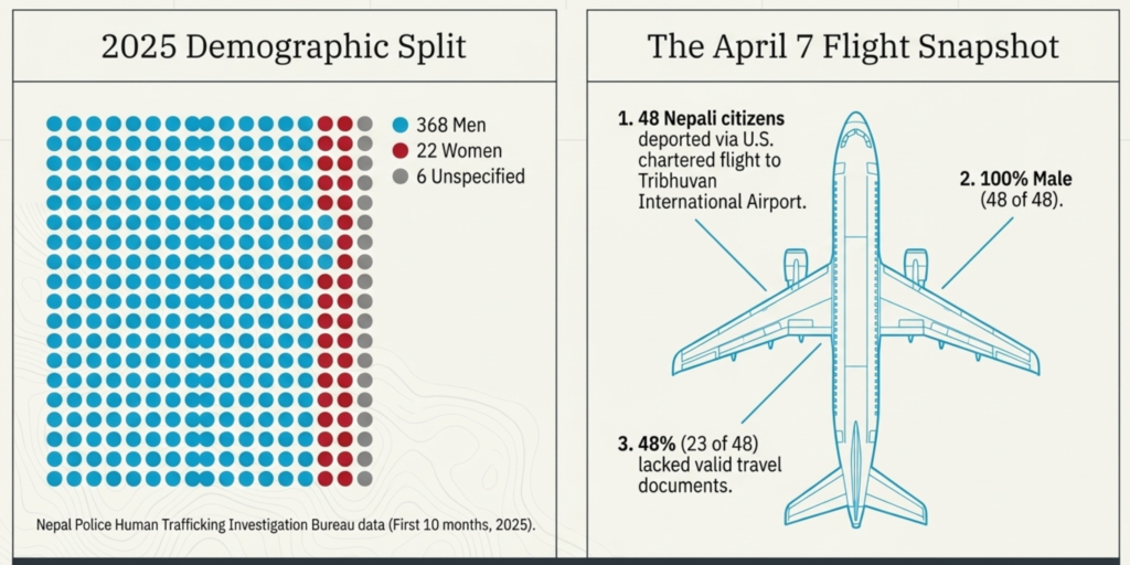 The report said 396 Nepali citizens were deported from the United States during the first 10 months of 2025, according to figures from Nepal Police’s Human Trafficking Investigation Bureau. Of them, 368 were men and 22 were women, the bureau’s data showed.